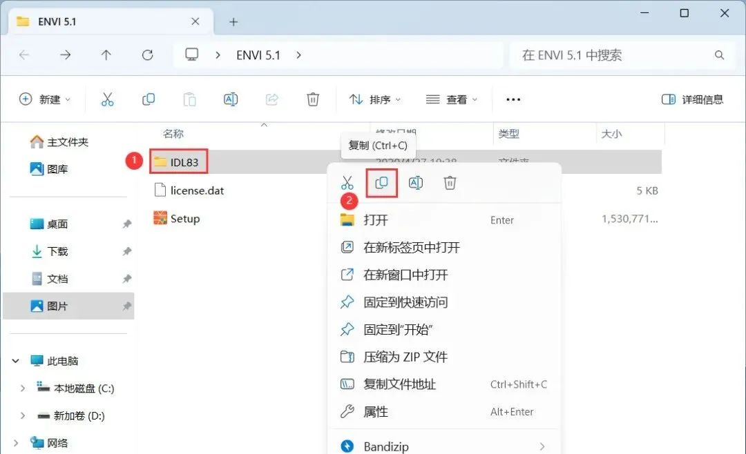 18、回到ENVI 5.1文件夹,找到【IDL83】文件夹,再右键点击【复制按钮】