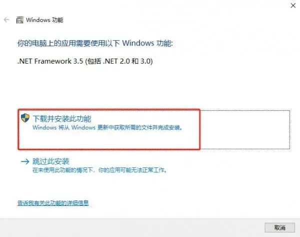 4、一般要安装net Framework3.5插件进行下载并安装此功能。