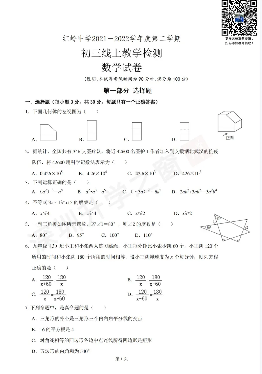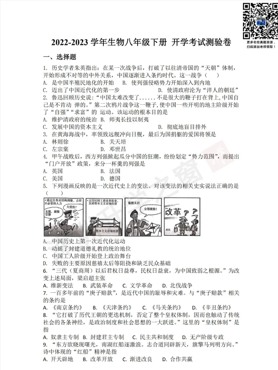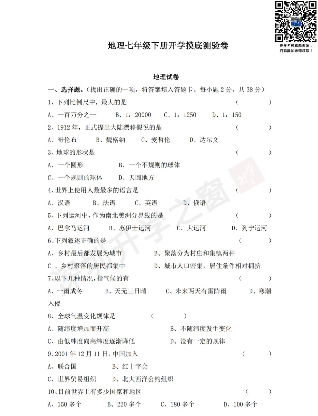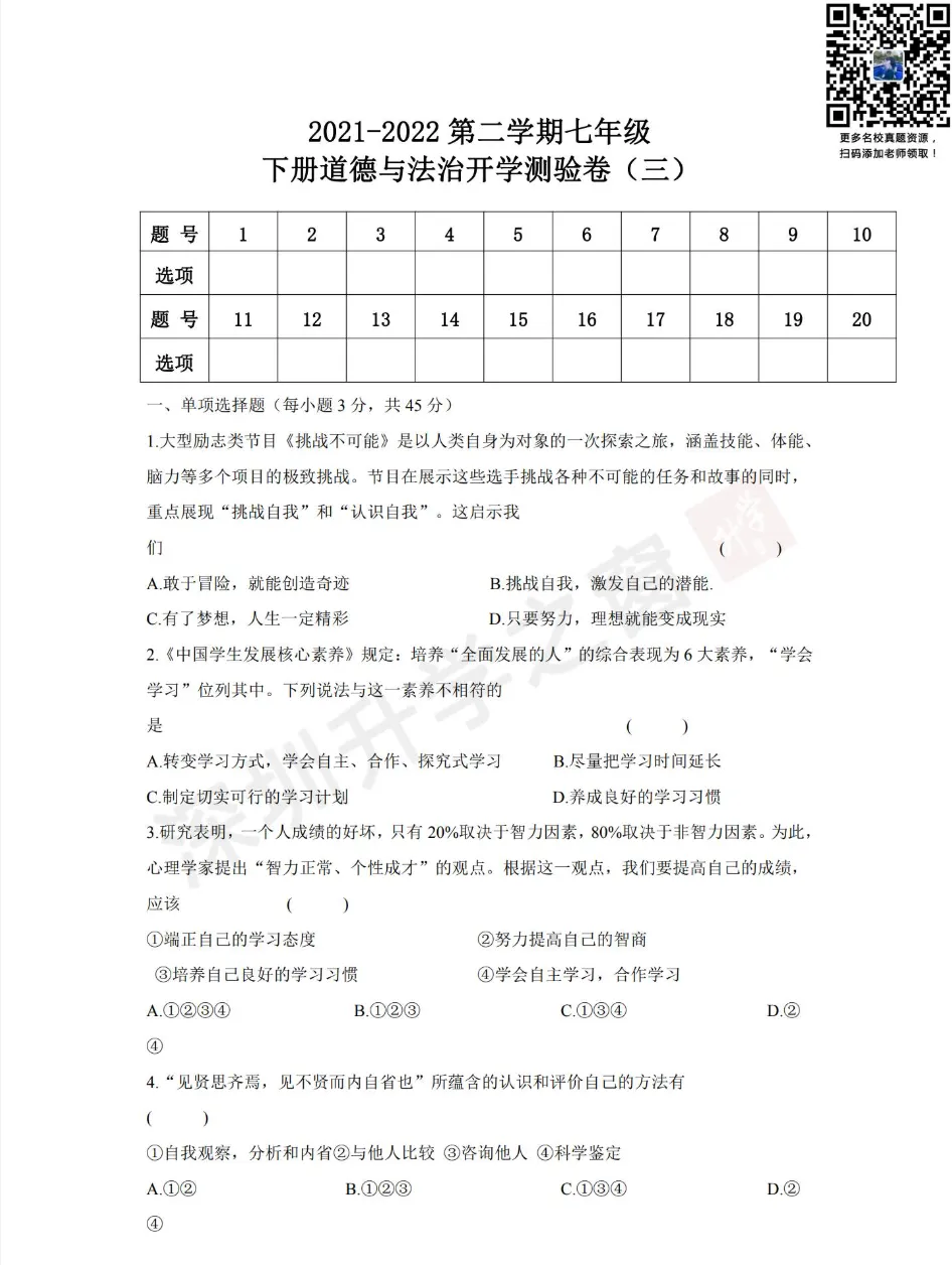 ②公众号对话框回复关键词【开学考】领取真题
