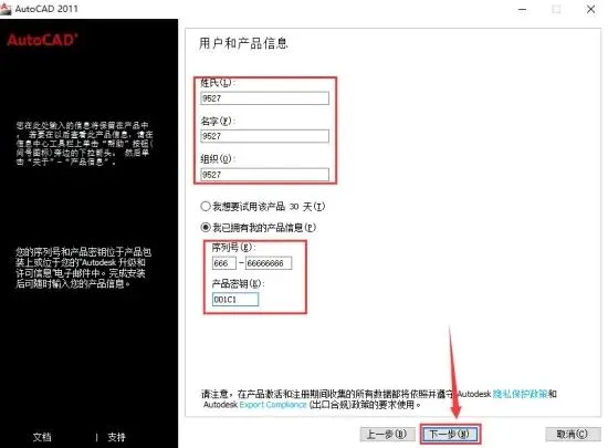 9、填写姓氏、名字、组织、填写序列:666-66666666,产品密钥:001C1,再点击【下一步】选项。