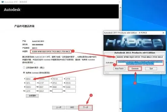 21、把注册页面上的申请号,复制粘贴到注册机中,点击Generate生成激活码。再把注册机里面的激活码复制粘贴到激活框中,点击下一步。