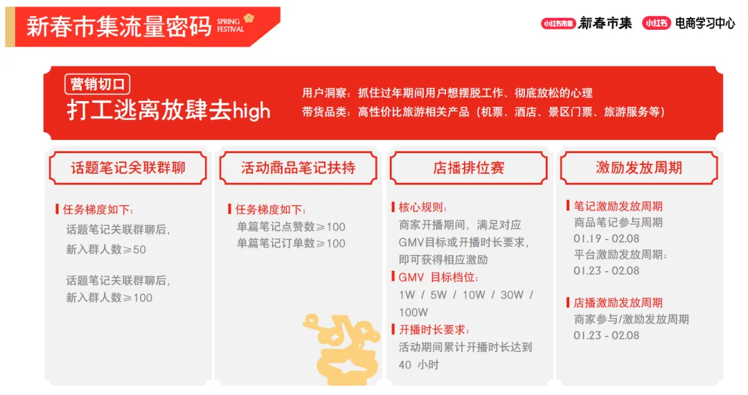 报告指出,小红书新春市集的核心营销切口是“打工逃离放肆去high”,精准抓住用户春节摆脱工作、彻底放松的心理。