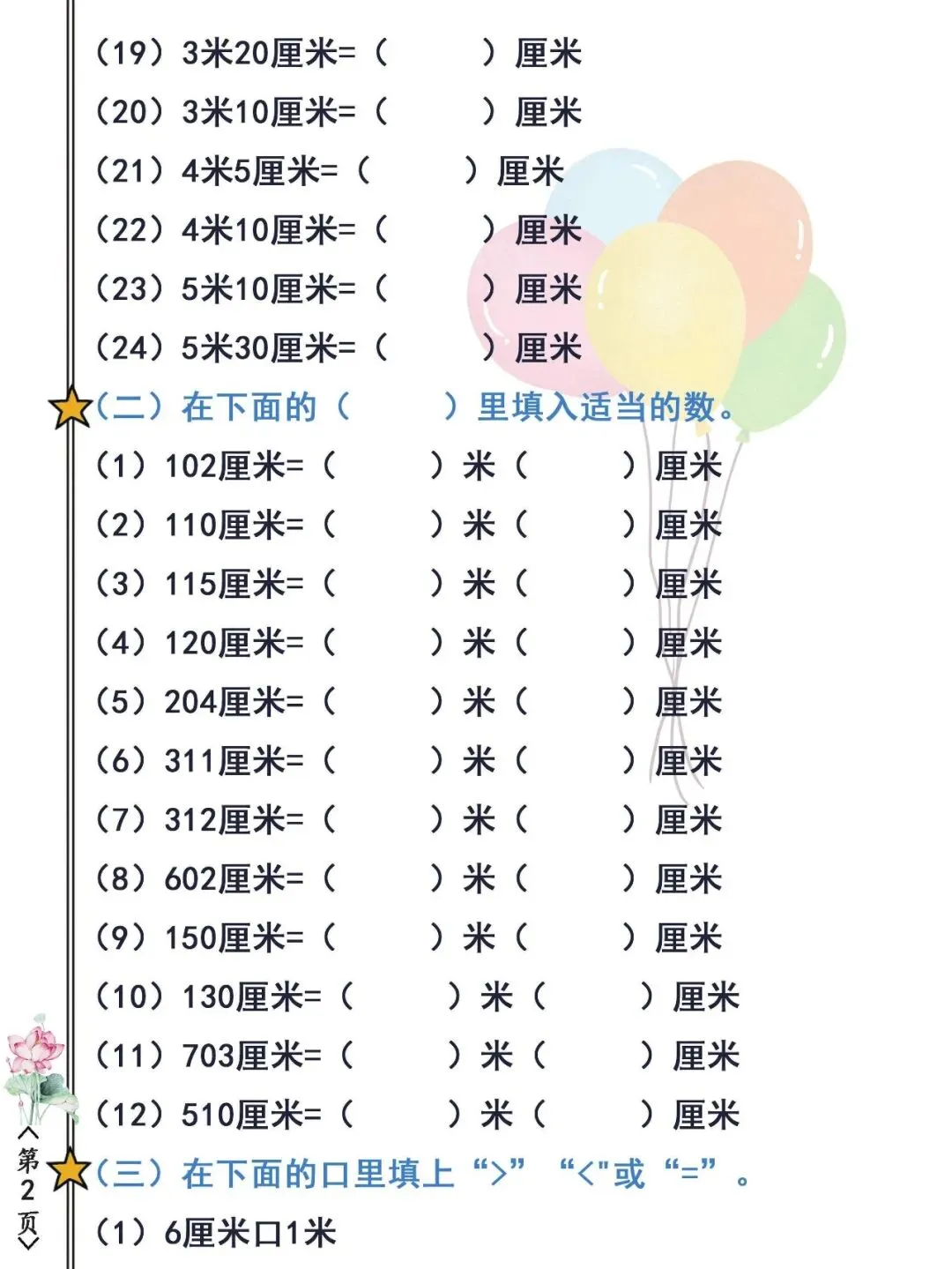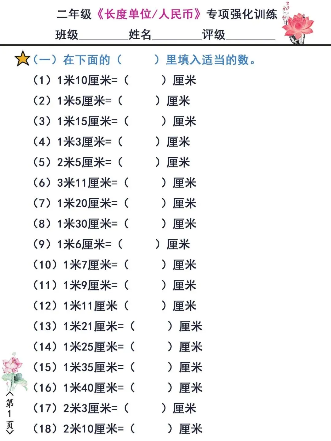【免费下载】二年级(下)数学 长度单位、人民币专项强化训练,PDF电子版,共9页,可打印