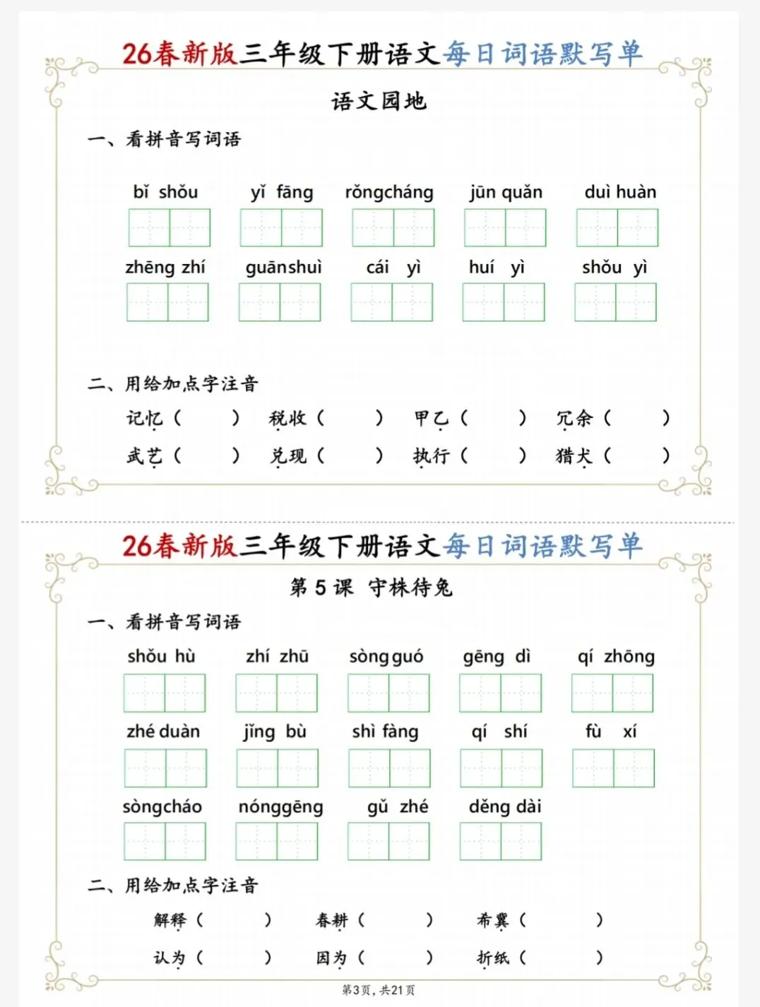 文末免费下载|26春新三下语文1-27课每日词语默写单(含答案21页)
