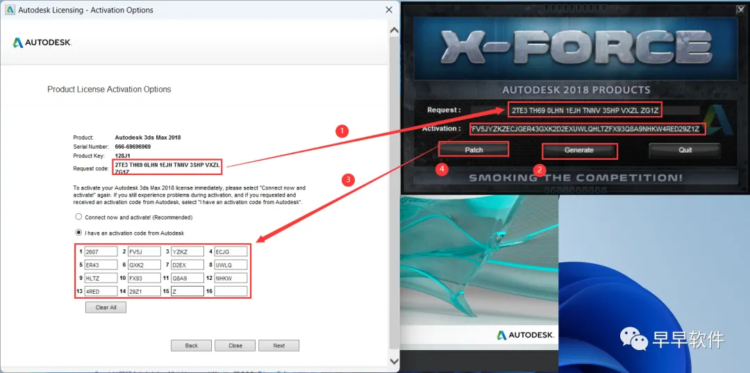 20、打开软件界面,将软件的【Request code】填入到程序的【Requset】内,再点击【Generate】,将程序的【Activation】填入到软件的【I have an…】内,再点击【Patch】