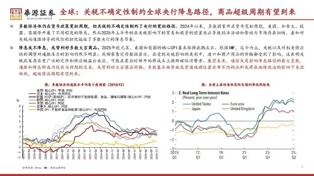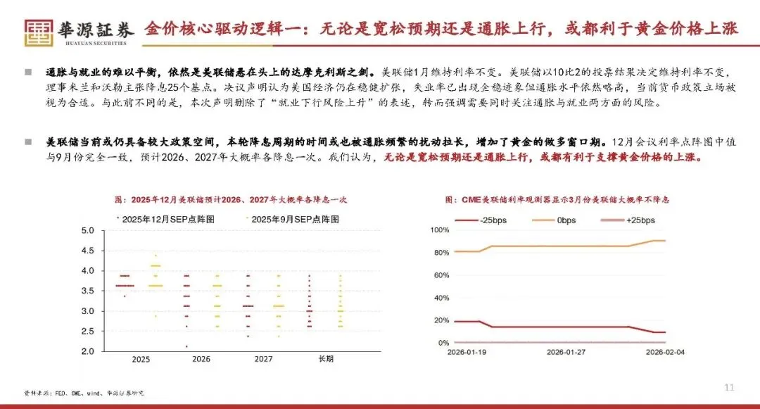 美联储降息周期拉长,实际利率下行或通胀上行均对金价形成支撑;全球央行持续增储黄金,“去美元化”趋势强化其货币属性,金价底部支撑稳固。
