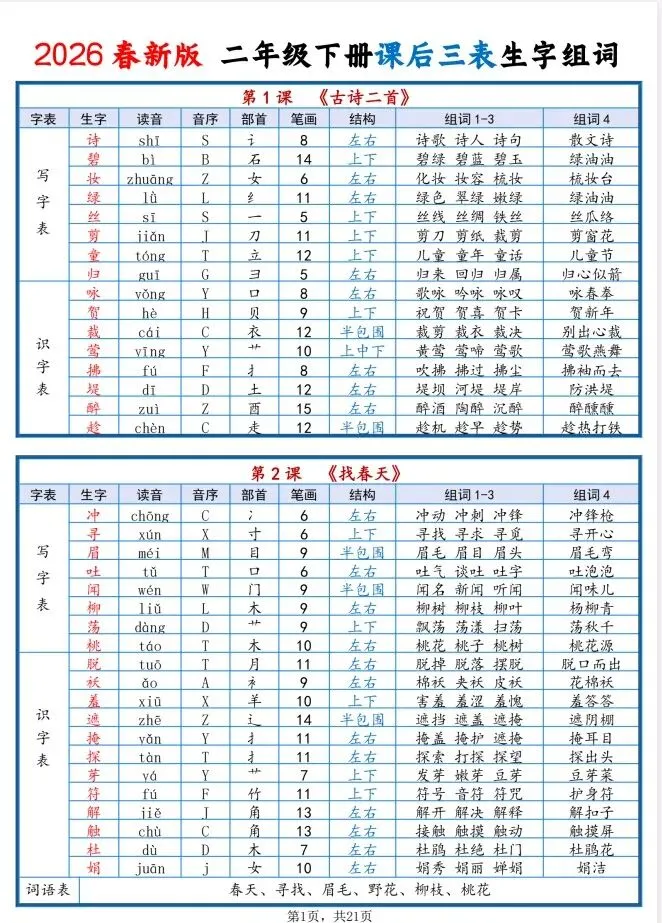 今天给大家整理了26春新二下语文课后三表生字组词(21页)有空白版,转发给朋友或班级群,受益更多人,帮助孩子学习!