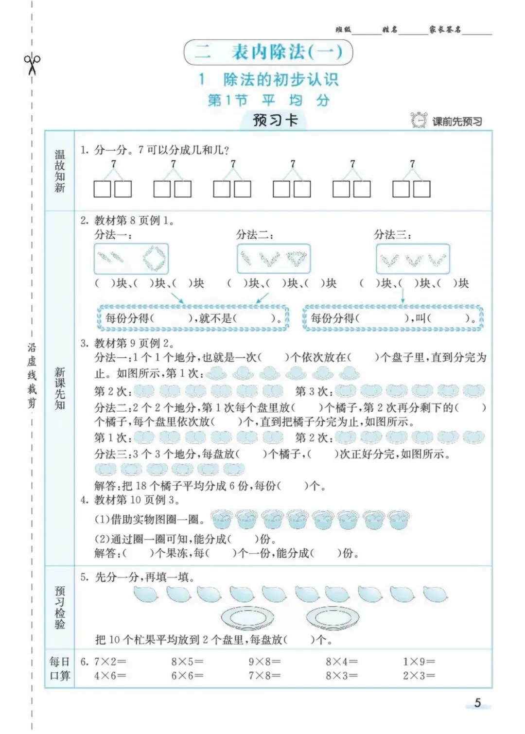 《人教版数学2年级《预习卡+课课练》》需要的家长抓紧打印出来,让孩子练一练吧。