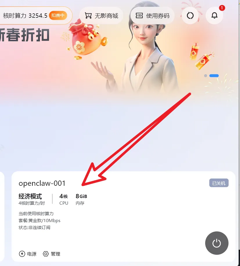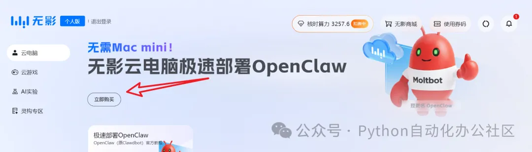 好,我们继续。再回到刚才客户端里的主页,会看到openclaw的宣传图,点击立即购买。