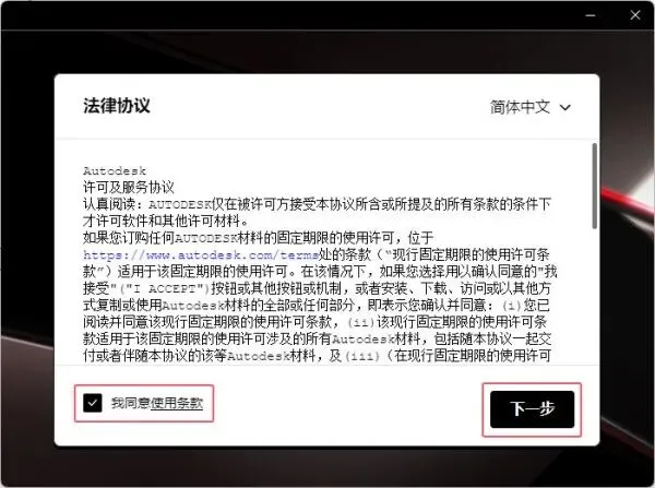 3、进行加载后,弹出此对话框,勾选“我同意使用条款”,点击下一步。