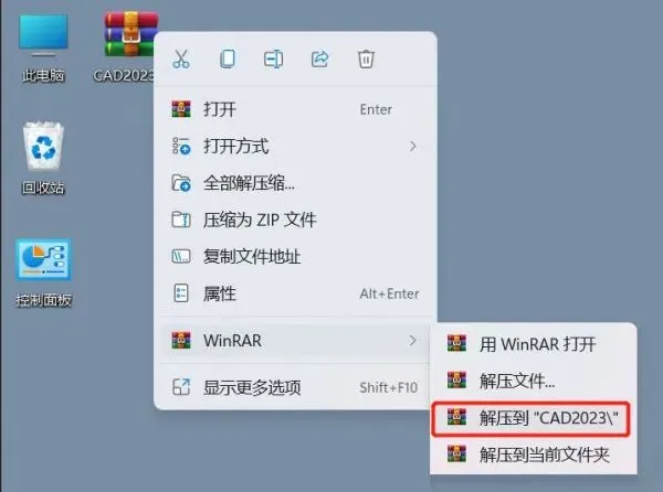 1、右击下载好的CAD2023安装包,选择解压软件,再选择解压到CAD2023选项。
