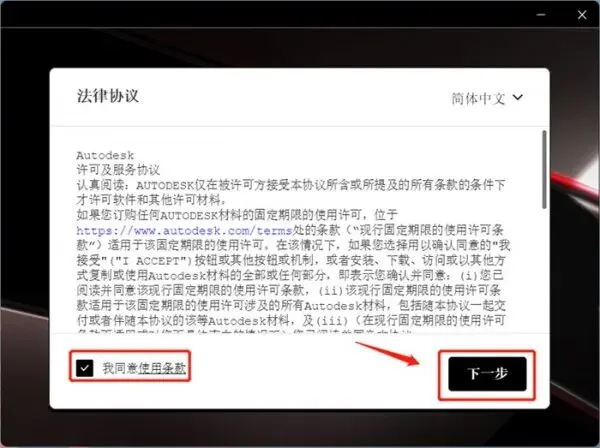 4、勾选项【我同意使用条款】选项,再点击【下一步】选项。