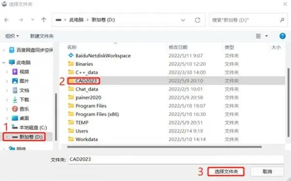 6、再点击D盘,新建CAD2023文件夹。再点击选择文件夹。