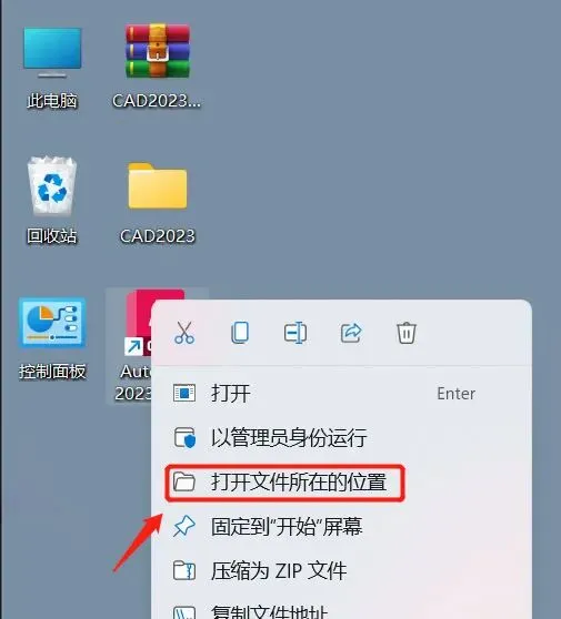 12、返回电脑桌面,右击CAD2023软件图标,点击打开文件所在的位置。