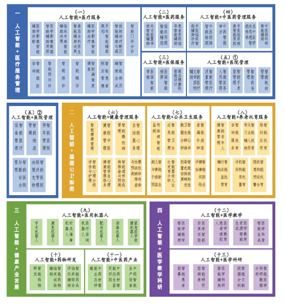 值得一提的是,《参考指引》系统梳理了AI在医疗、医药、医保、中医药管理、医院运营、基层公共卫生服务、健康产业及医学教学科研等领域的4大领域、13个大类、84个典型应用场景,为行业绘制了清晰的“AI医疗地图”。图1.1卫生健康行业人工智能应用场景参考指引全景图
