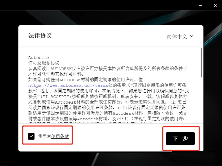 4、勾选我同意使用条款,然后点下一步