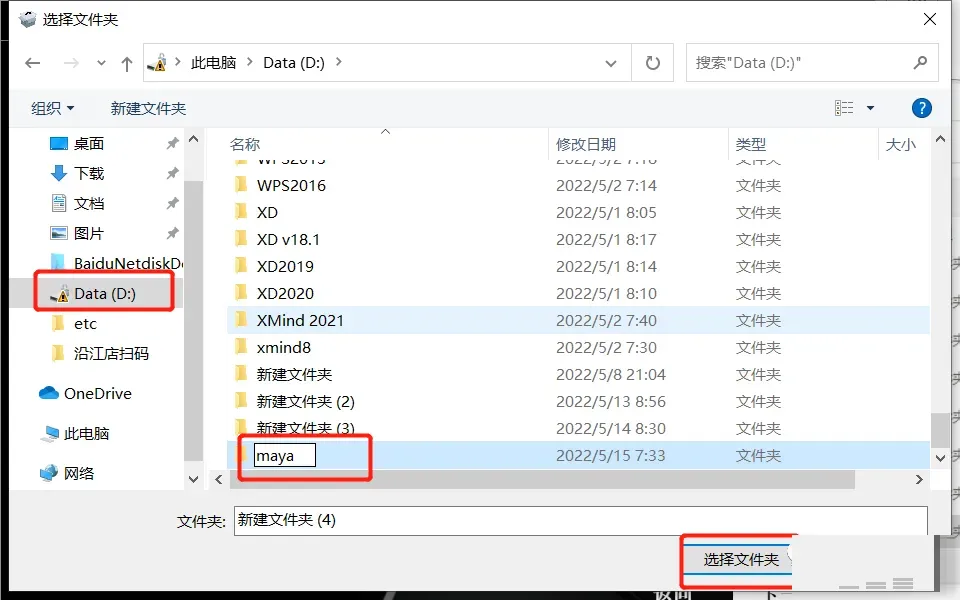 6、①双击需要将软件安装的磁盘(如:C盘)②进入展开后的磁盘,在空白处鼠标右击新建一个【maya】的文件夹③点击【选择文件夹】