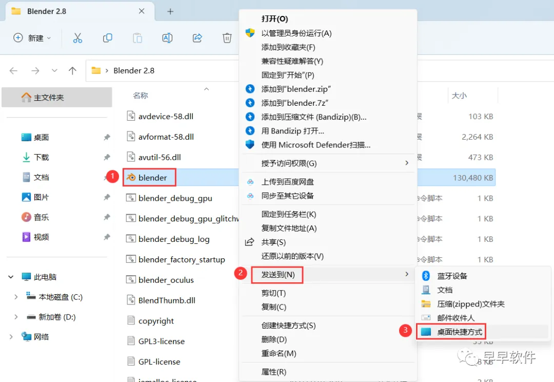 3、找到【blender】应用程序,右键依次点击【显示更多选项】、【发送到】、【桌面快捷方式创建】,完成blender软件桌面快捷方式的创建