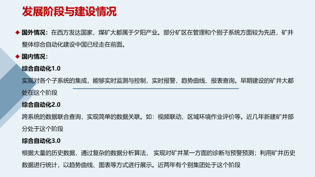 在信息化标准体系方面,本方案提出建立统一的数据定义、系统集成、数据安全和控制策略标准,确保矿井综合自动化系统的数据共享、系统集成、信息融合与联动应用的成功实施。通过这些标准的建立,为矿井建设的持续接入与应用扩展提供有力支持。