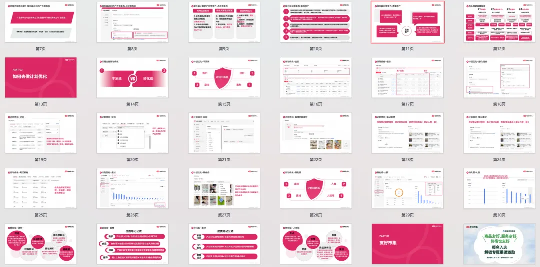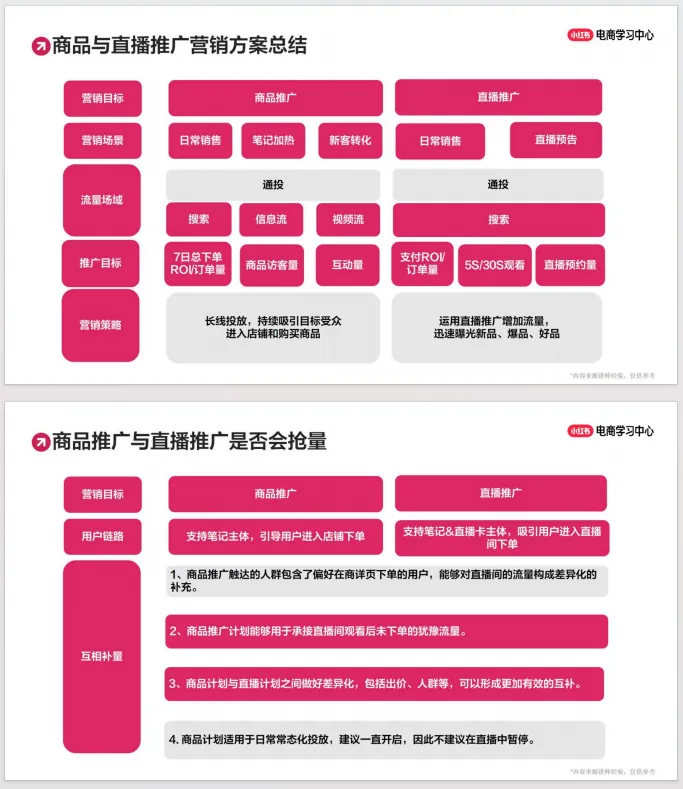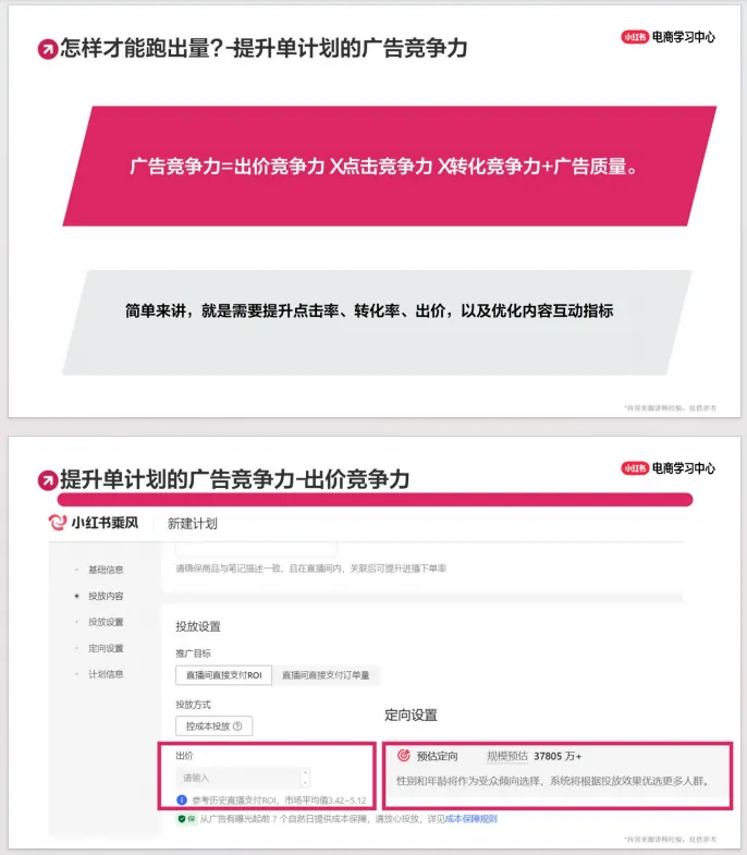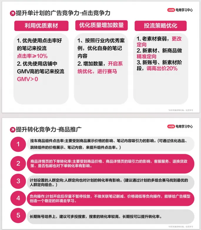 第二,指南详细讲解了如何进行计划优化,针对“计划不消耗”和“转化低”两大常见问题,提供了从账户、素材、定向、出价到“人货场”的全面排查与优化路径。例如,通过分析人群画像调整定向,利用优质笔记公式优化素材,以及检查商品价格、详情页、直播话术、客服售后等环节来提升整体转化效率。