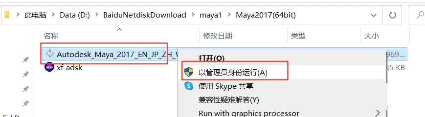 19、打开安装包解压后的【Maya2017(64bit)】文件夹,鼠标右击【xf-adesk】选择【以管理员身份运行】。运行【xf-adesk】前:先关闭“所有杀毒软件(部分电脑自带的“迈克菲”也要关闭)、防火墙、Windows Defender”,否则可能会被杀毒软件误杀无法运行。若已经没有该文件,需重新解压安装包