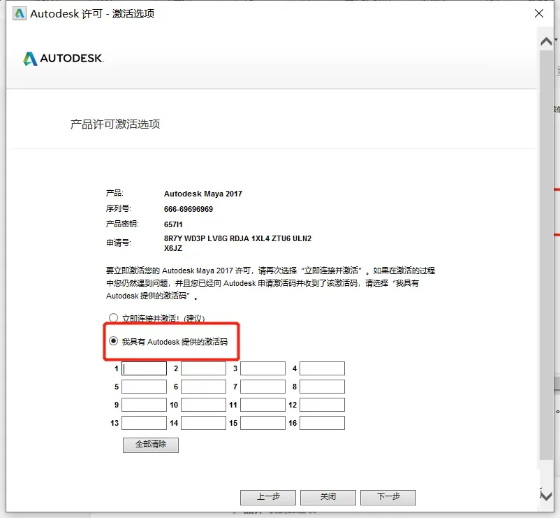 18、选择【我具有Autodesk提供的激活码】(不要关闭此界面)