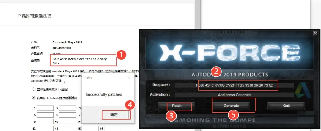20、生成激活码:①使用快捷键“Ctrl+C”复制【申请号】后的代码;②使用快捷键“Ctrl+V”将代码粘贴到【Request】后的框中;③点击【Patch】;④点击【确定】;⑤点击【Generate】生成激活码