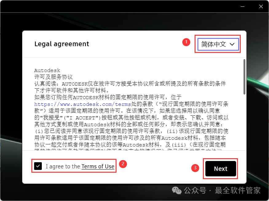 5、语言选择【简体中文】,勾选【我同意】,再点击【Next】