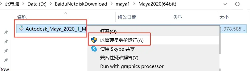 18、打开安装包解压后的【MAYA2020】文件夹,鼠标右击【xf-adesk】选择【以管理员身份运行】。运行【xf-adesk】前:先关闭“所有杀毒软件(部分电脑自带的“迈克菲”也要关闭)、防火墙、Windows Defender”,否则可能会被杀毒软件误杀无法运行。若已经没有该文件,需重新解压安装包