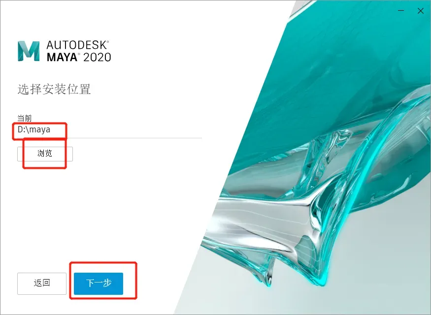 6、点击【浏览】可更改安装位置(建议不要安装在C盘,可以在D盘或其它磁盘下新建一个“MAYA”文件夹,注:安装路径中不要有中文),点击【安装】