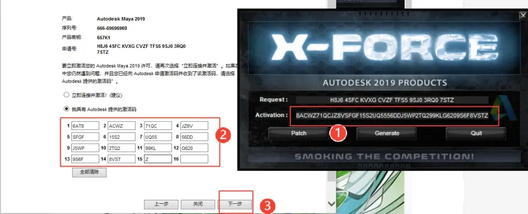 19、生成激活码:①使用快捷键“Ctrl+C”复制【申请号】后的代码;②使用快捷键“Ctrl+V”将代码粘贴到【Request】后的框中;③点击【Patch】;④点击【确定】;⑤点击【Generate】生成激活码
