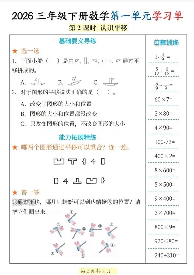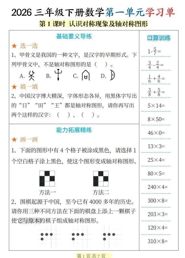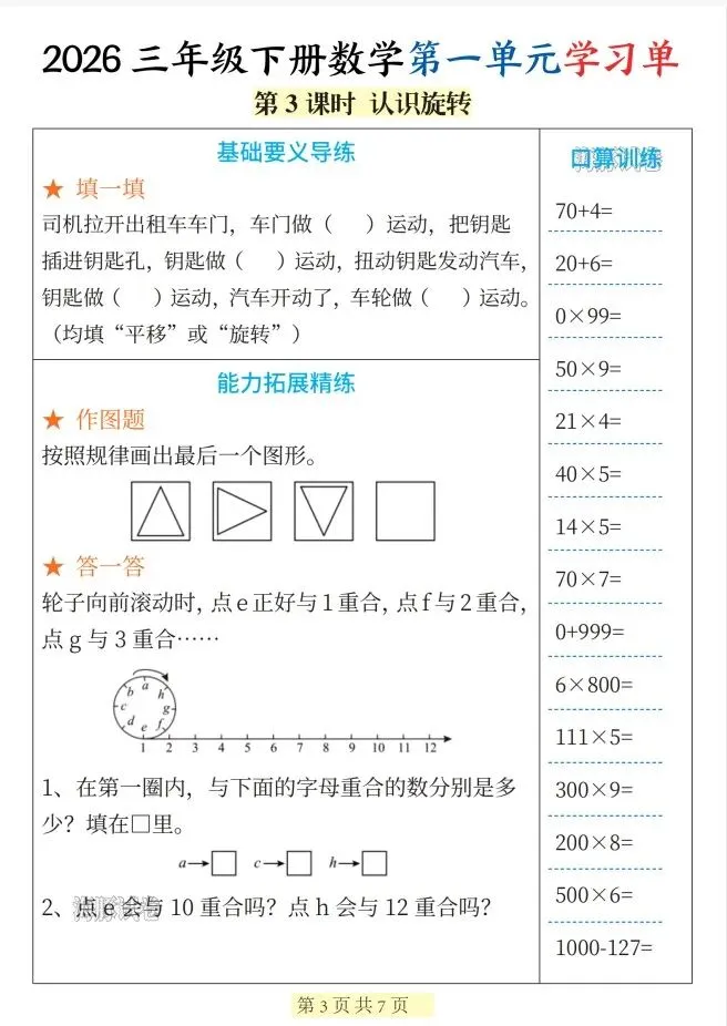 今天给大家整理了26新三年级数学下册第一单元学习单),转发给朋友或班级群,受益更多人,帮助孩子学习!