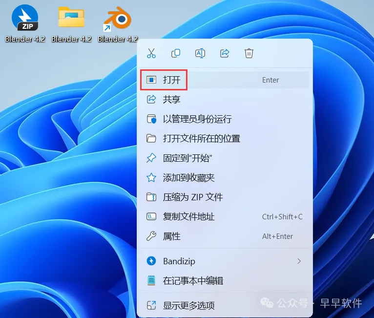 10、回到桌面,右键桌面上的【Blender 4.2软件图标】,点击【打开】
