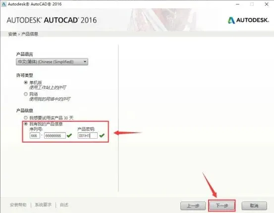 7、然后输入序列号:666-66666666,再输入产品密钥:001H1。再点击【下一步】选项。设置好路径选项,点击【安装】选项。