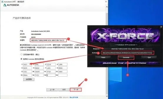 18、然后再把注册页面的申请码,把复制的申请号粘贴到注册机中,再点击Generate键。获得激活码,把激活码复制粘贴到注册页面中,再点击【下一步】选项。