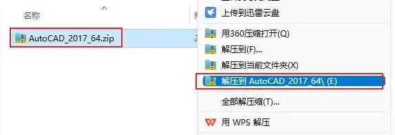 1、右击下载好后AutoCAD2017安装包,选择解压方式。