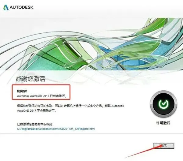 24、然后就可以成功激活AutoCAD2017软件了,再点击【完成】选项。