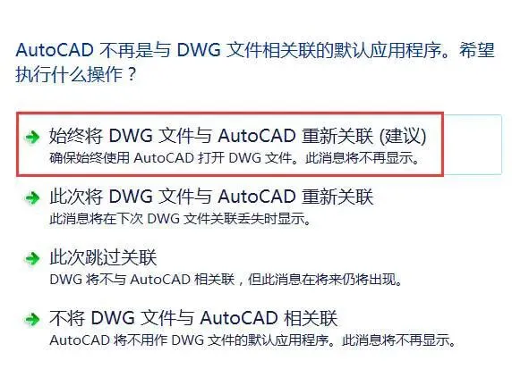 11、点击始终将DWG文件与AutoCAD重新关联。