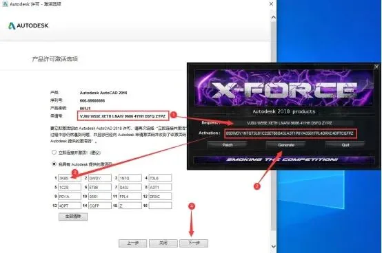 20、选择注册页面上的【申请号】,复制粘贴到注册机上,再点击GENERATE选项。获得的激活码再一次复制粘贴到注册页面中,再点击【下一步】选项。