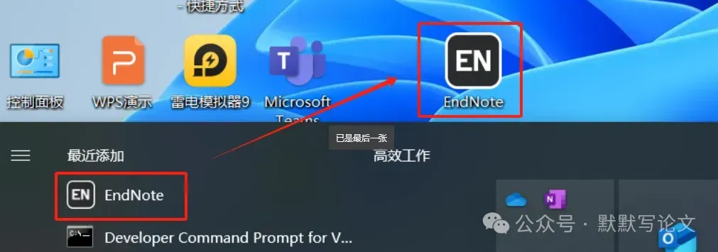 12.回到桌面,点击任务栏的【开始菜单】,在【所有应用】中找到【EndNote软件图标】,将软件图标拖到桌面上,完成软件桌面快捷方式的创建。