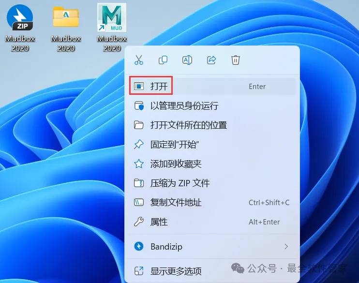 10、回到桌面,右键桌面上的【Mudbox 2020软件图标】,点击【打开】