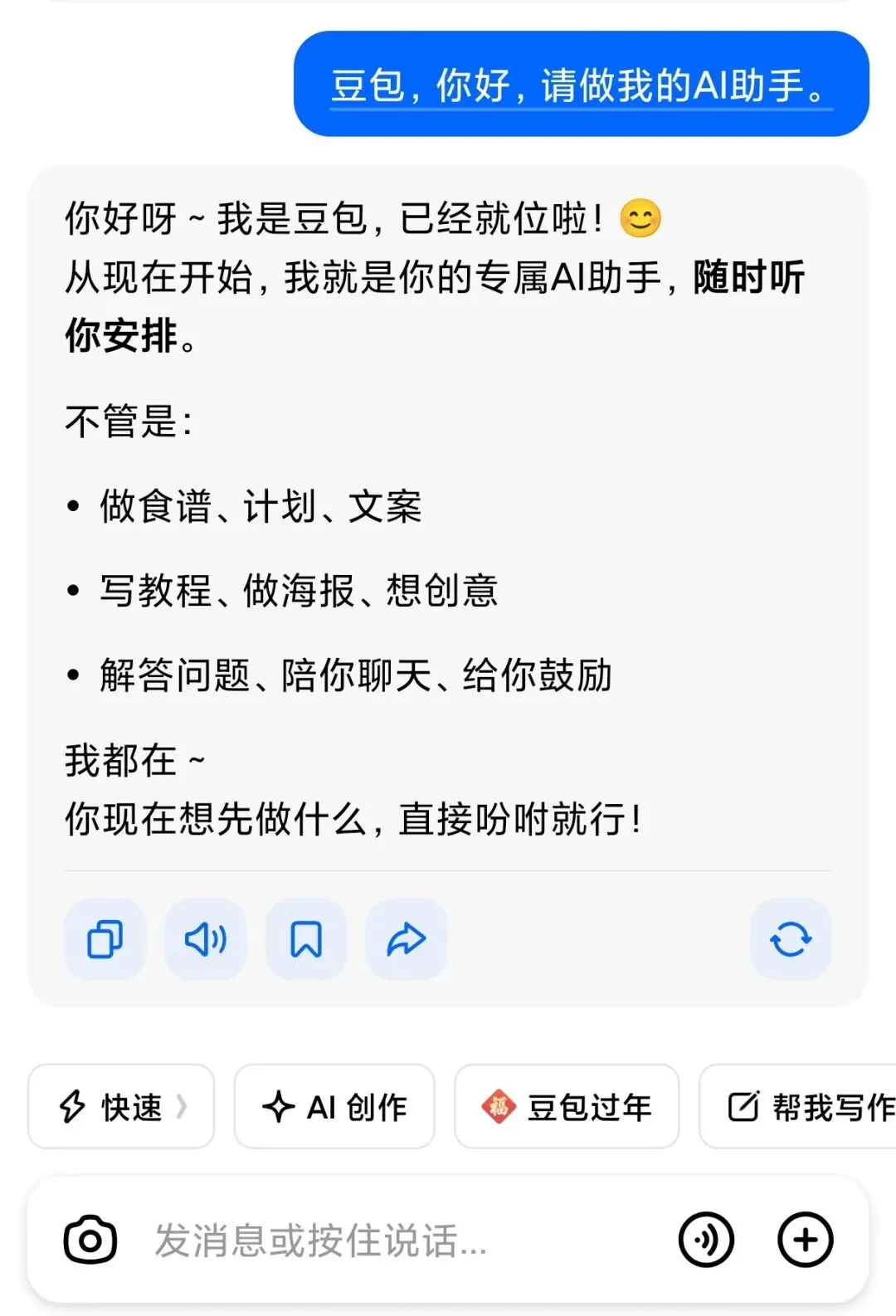 五、第五步:今天的小作业(超简单)今天不用学复杂功能,只做一件事:打开豆包,输入这句话:豆包,你好,请做我的AI助手。发送成功,就算正式入门。