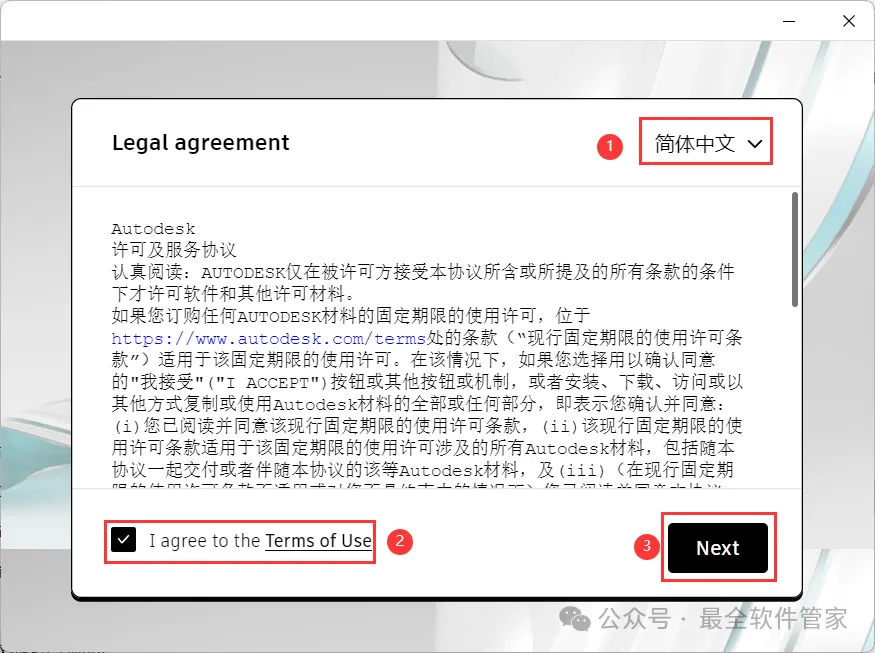 5、语言选择【简体中文】,勾选【我同意】,再点击【Next】