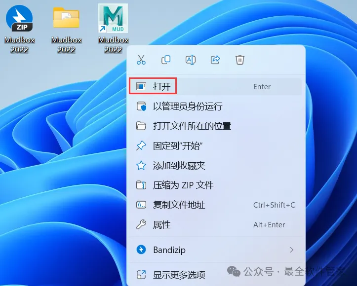 9、回到桌面,右键桌面上的【Mudbox 2022软件图标】,点击【打开】