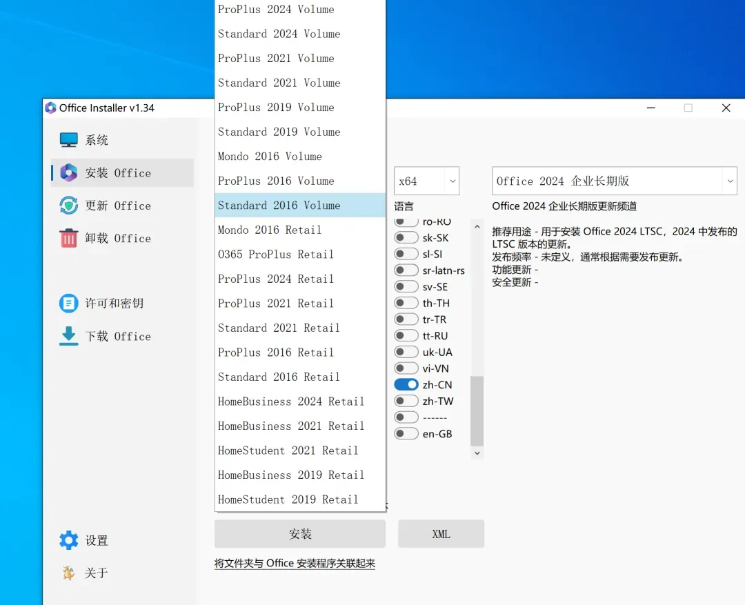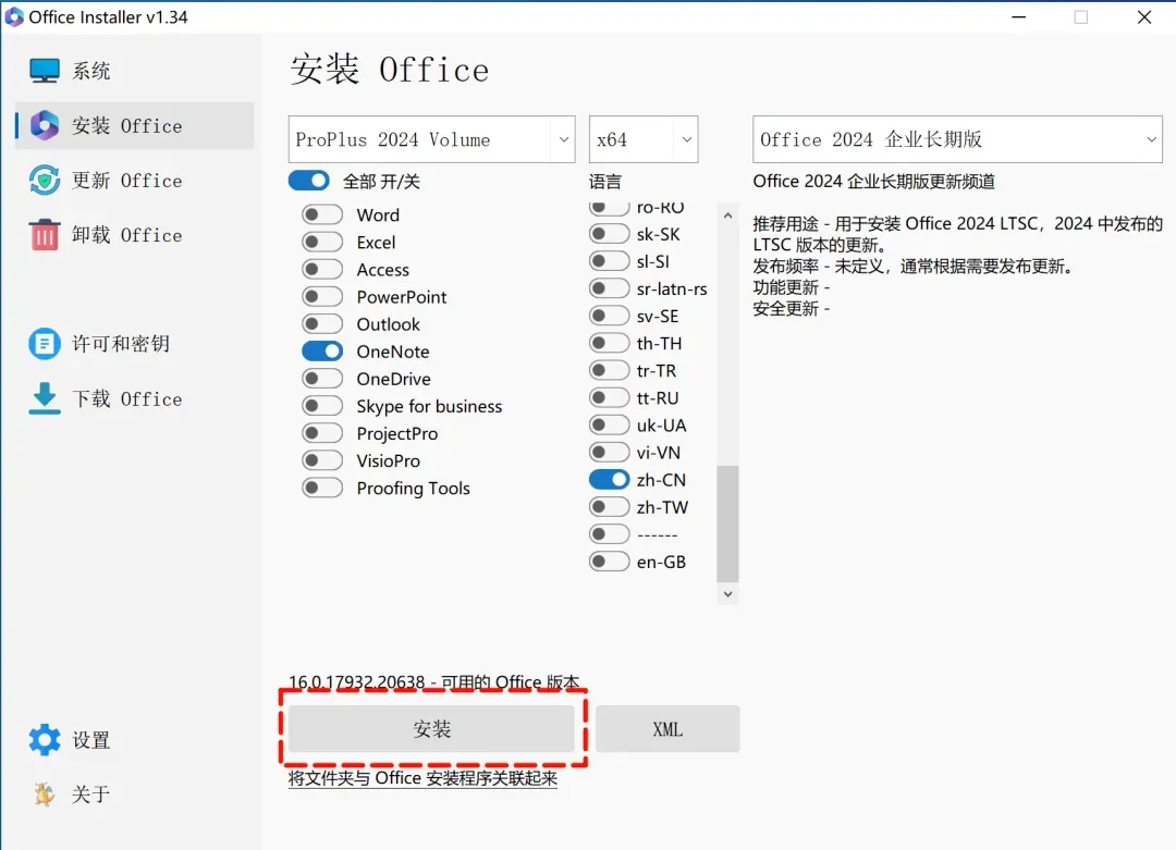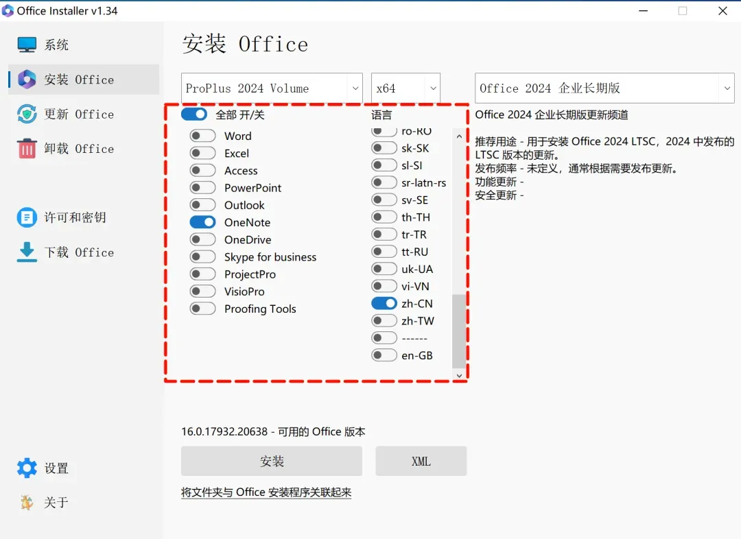 这款软件的核心功能是“组件级自定义安装”。 它的逻辑非常直观:在列表里选中你需要的版本(如 2021 或 2024)后,直接把 Skype、Publisher 这些用不到的组件勾选去掉。