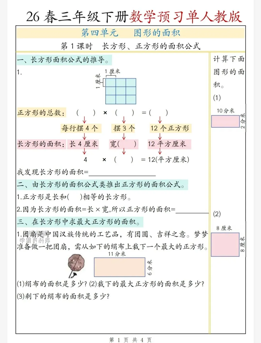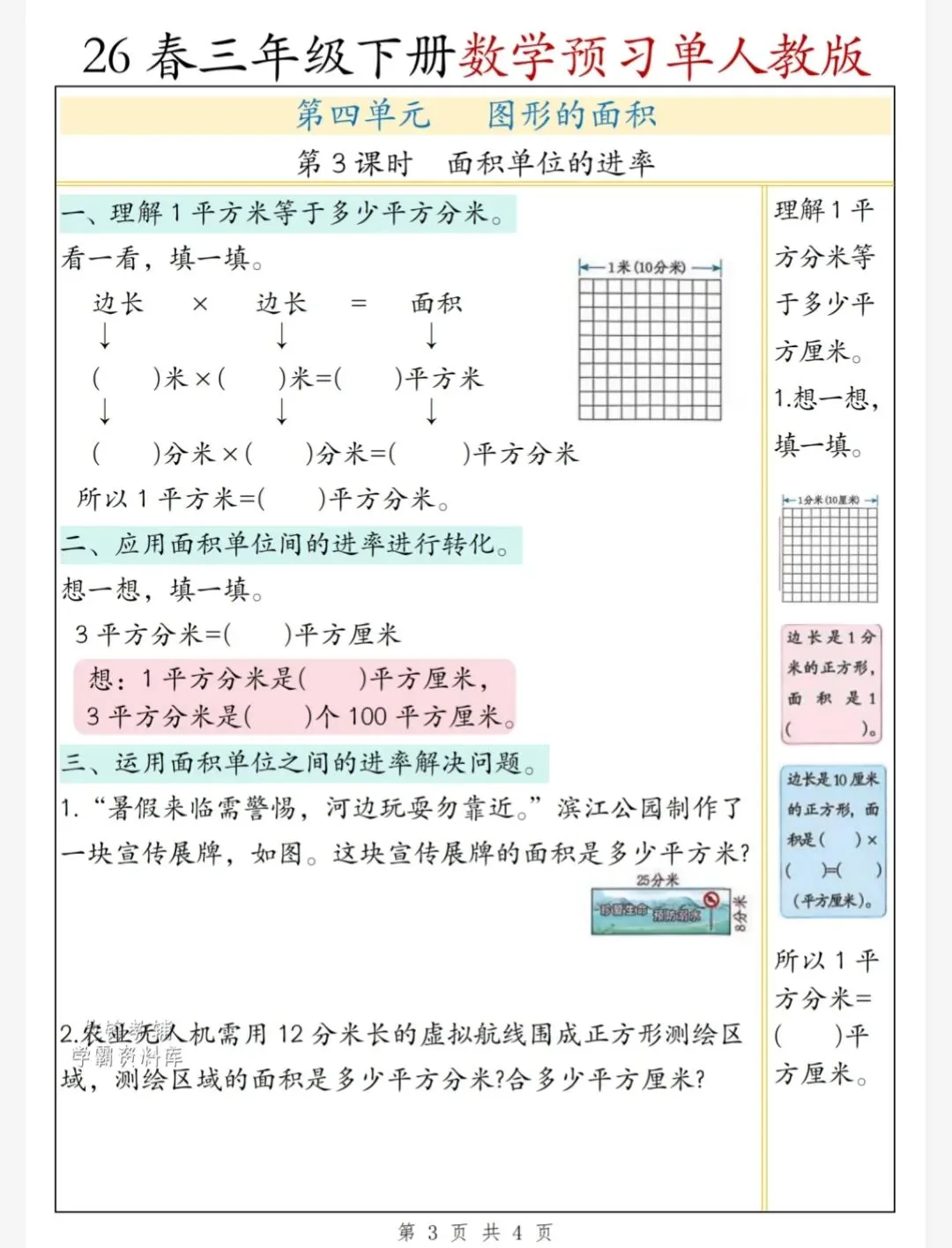 今天给大家整理了26春三年级数学人教版下册第四单元预习单,转发给朋友或班级群,受益更多人,帮助孩子学习!