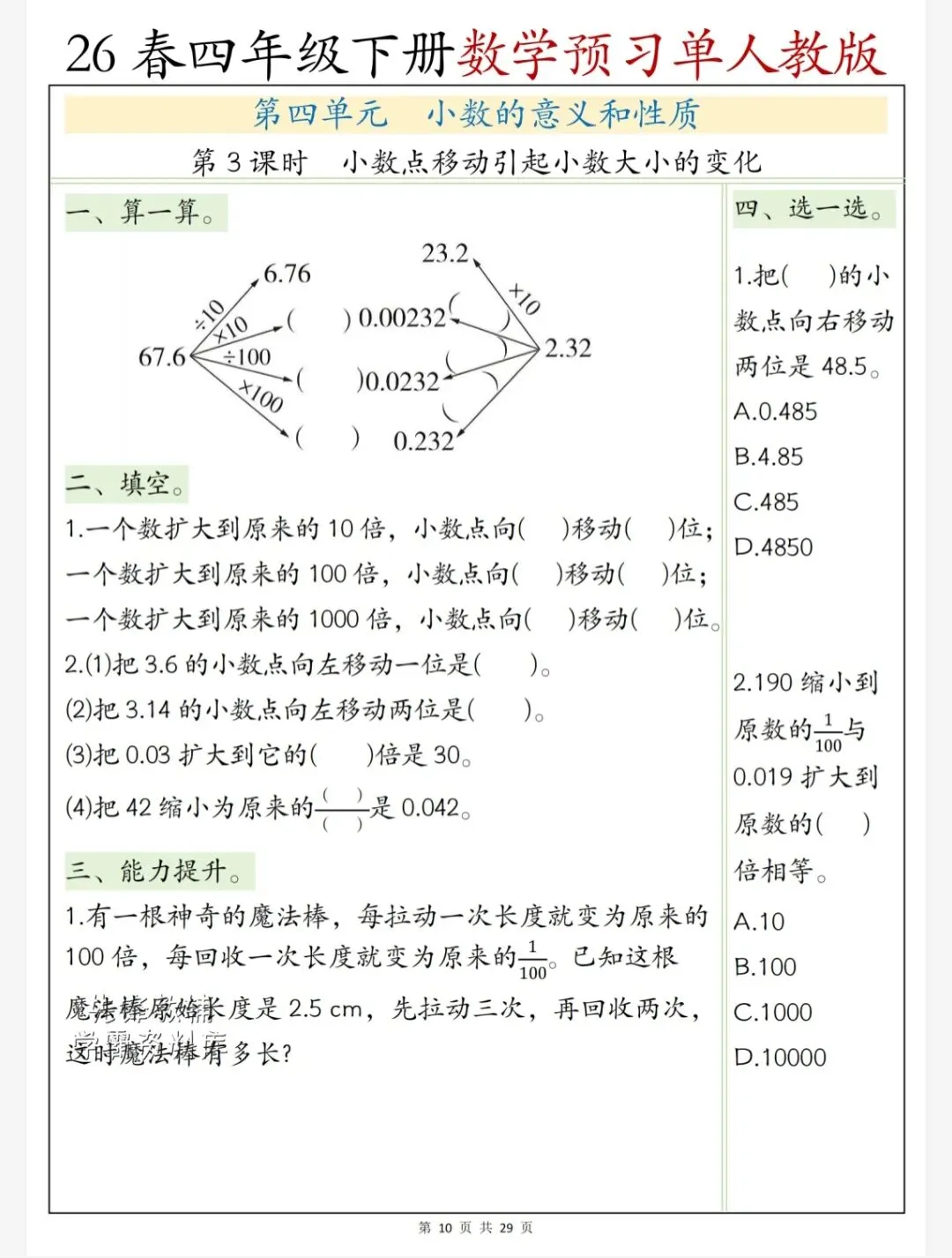 文末免费下载|26春四年级数学人教版下册第四单元预习单