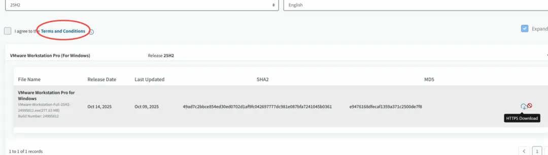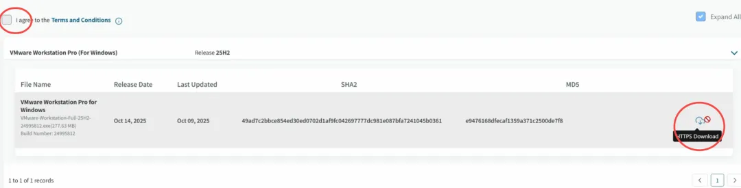 再点击HERE这个按钮进入到这个页面,Vmware在最下面选择对应的电脑版本例如下面这个,点击下载点击下载我这里已经下载过了,第一次在左上角的位置会有一个同意协议,但是这里都不让点,这个需要点击这个协议并滑动到最后一定要滑到最后,然后再返回到页面可以点击同意协议了