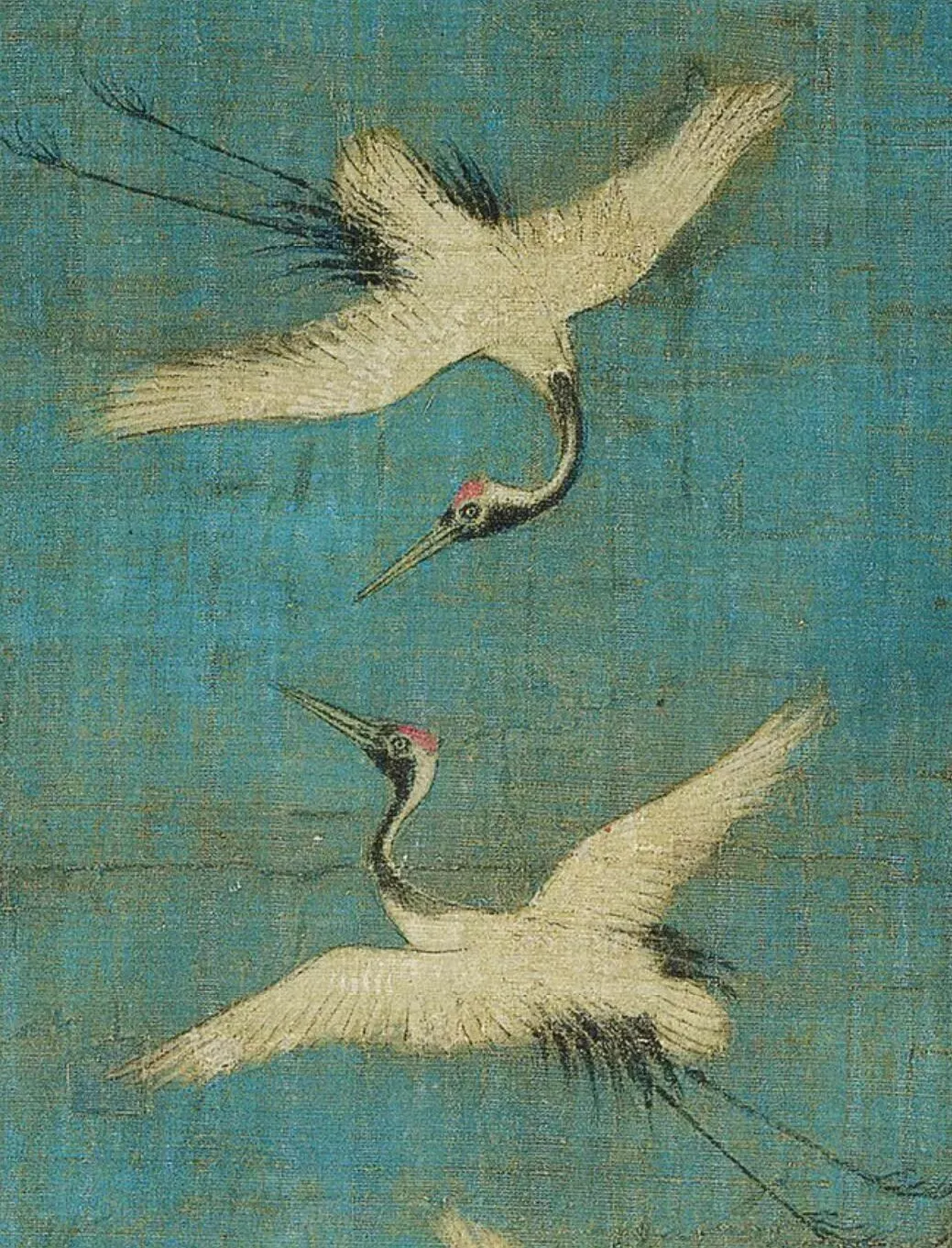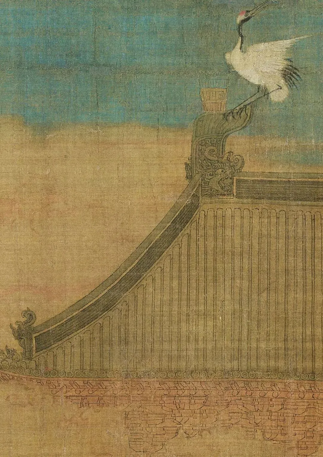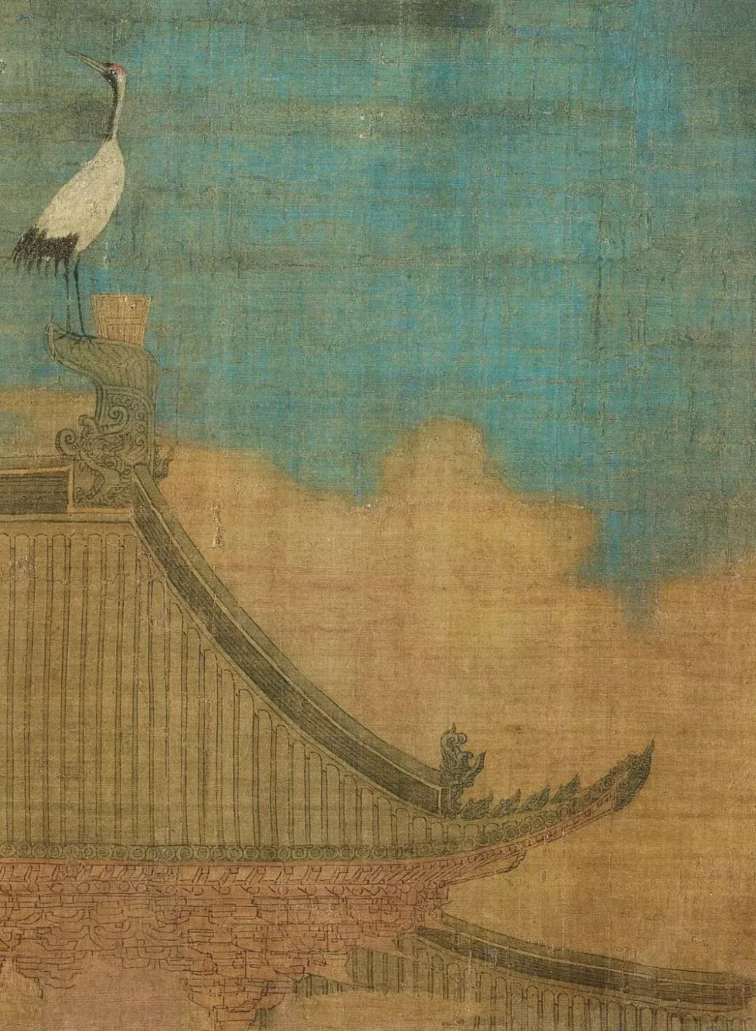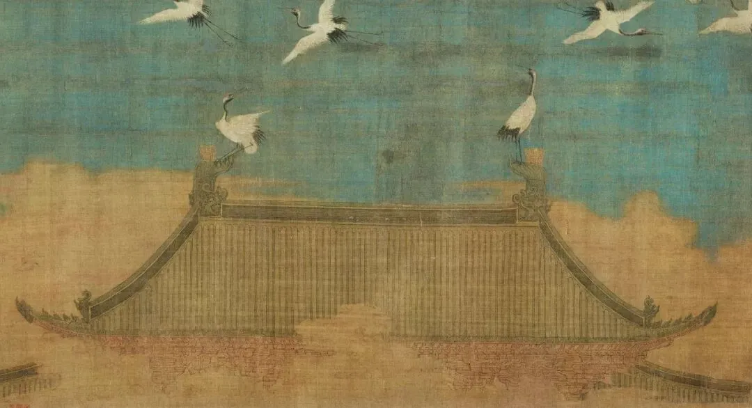 徽宗赵佶信奉道教,以道治国, 自称道君皇帝。《瑞鹤图》画面充满了道家的宁静与预言。蓝天祥云,鹤舞于金色的殿顶,是徽宗对于天地人合一之解。一方面,皇宫殿宇端端正正置于画面下方,均衡对称,留出三分之二湛蓝天空,正大光远,大气天成,颇具皇家风范。另一方面,仙鹤有表明志向高洁、品德高尚之意,又是代表长生不死的神禽,以此“祥云瑞鹤”来隐喻王朝的吉祥。