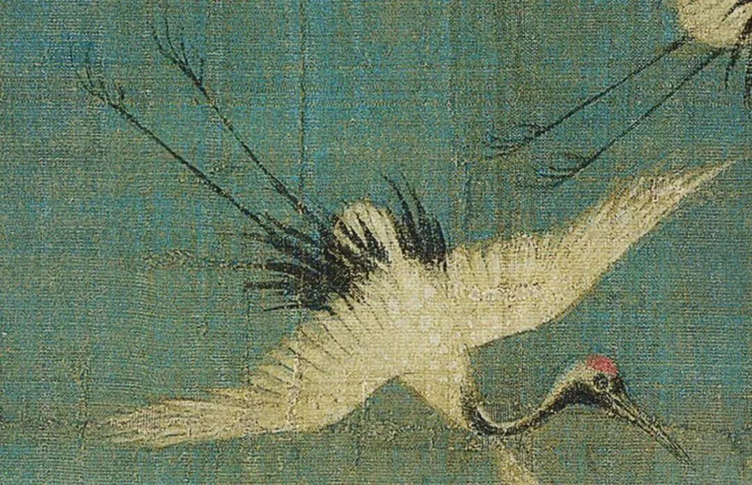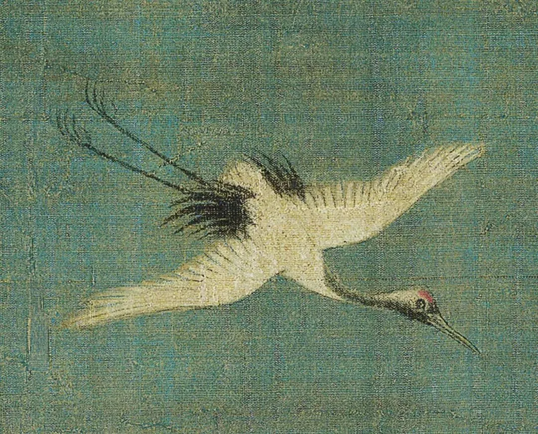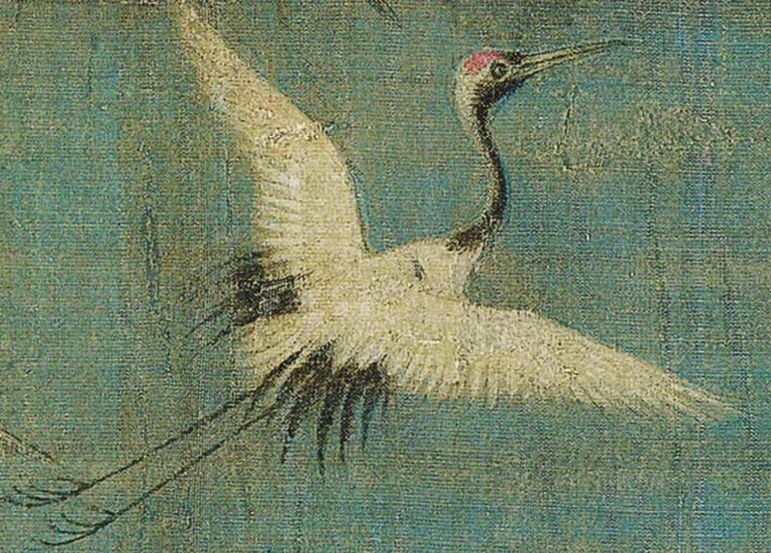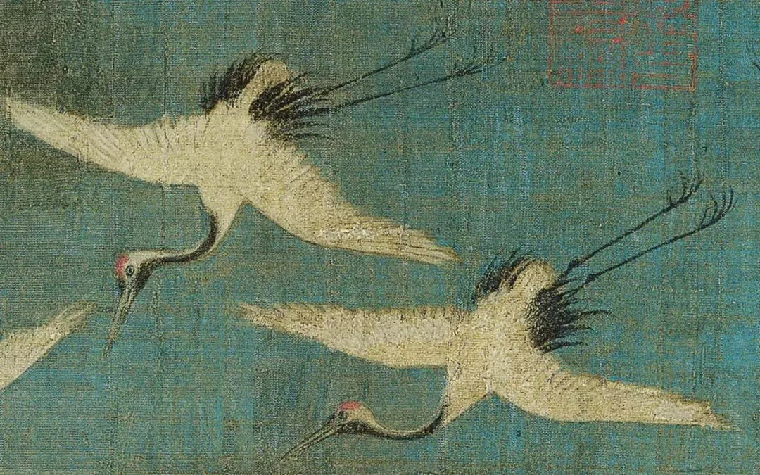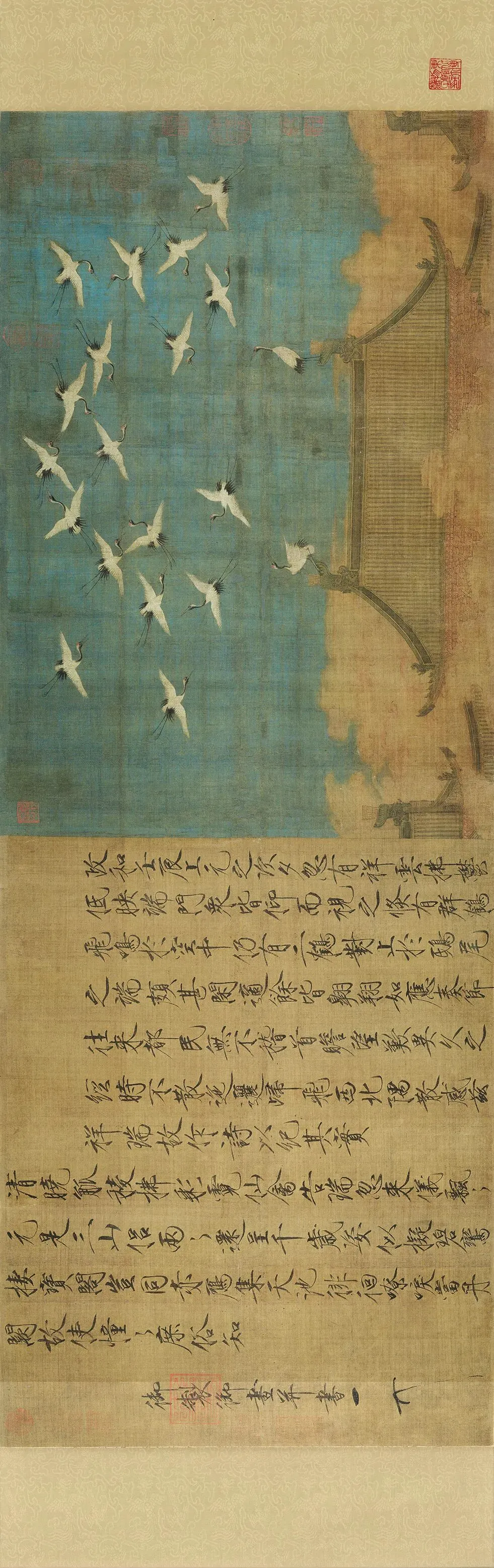 徽宗赵佶信奉道教,以道治国, 自称道君皇帝。《瑞鹤图》画面充满了道家的宁静与预言。蓝天祥云,鹤舞于金色的殿顶,是徽宗对于天地人合一之解。一方面,皇宫殿宇端端正正置于画面下方,均衡对称,留出三分之二湛蓝天空,正大光远,大气天成,颇具皇家风范。另一方面,仙鹤有表明志向高洁、品德高尚之意,又是代表长生不死的神禽,以此“祥云瑞鹤”来隐喻王朝的吉祥。